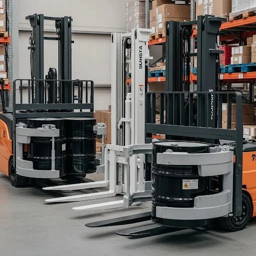 Drum handlers and paper roll clamps offer specialised securement and handling methods that eliminate manual repositioning and mitigate spill or crush risks for cylindrical loads; drum handlers typically cradle or clamp a drum and may include rotation features, while roll clamps engage the cylindrical surface for axial support. In beverage and chemical warehouses, drum handlers prevent spills during transport and allow safe rotation for dispensing, while paper roll clamps protect the core and outer sheet during movement and stacking in converting plants. These attachments improve cycle time by allowing single-step pick, move and place operations, and they reduce damage-related waste and the need for secondary packaging. When integrating these attachments, confirm the drum diameter and roll radius compatibility, and ensure the forklift’s hydraulics and carriage align with the attachment’s mount and flow requirements.